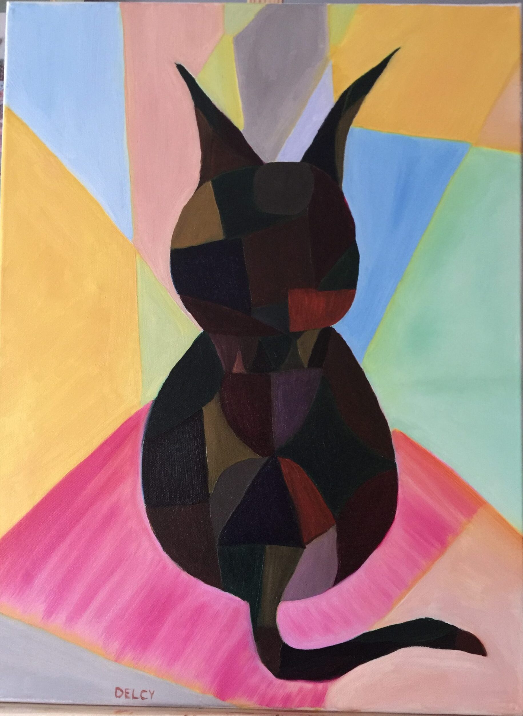 Purrfectly Dreamy is an 18×24 original oil painting – a one-of-a-kind, geometric cat artwork that brings the language of dreams and imagination into your space. Made up of layered pastel patterns and bold dark shapes, the peaceful silhouette of a cat has its back to you against a background that feels both modern and ethereal.
