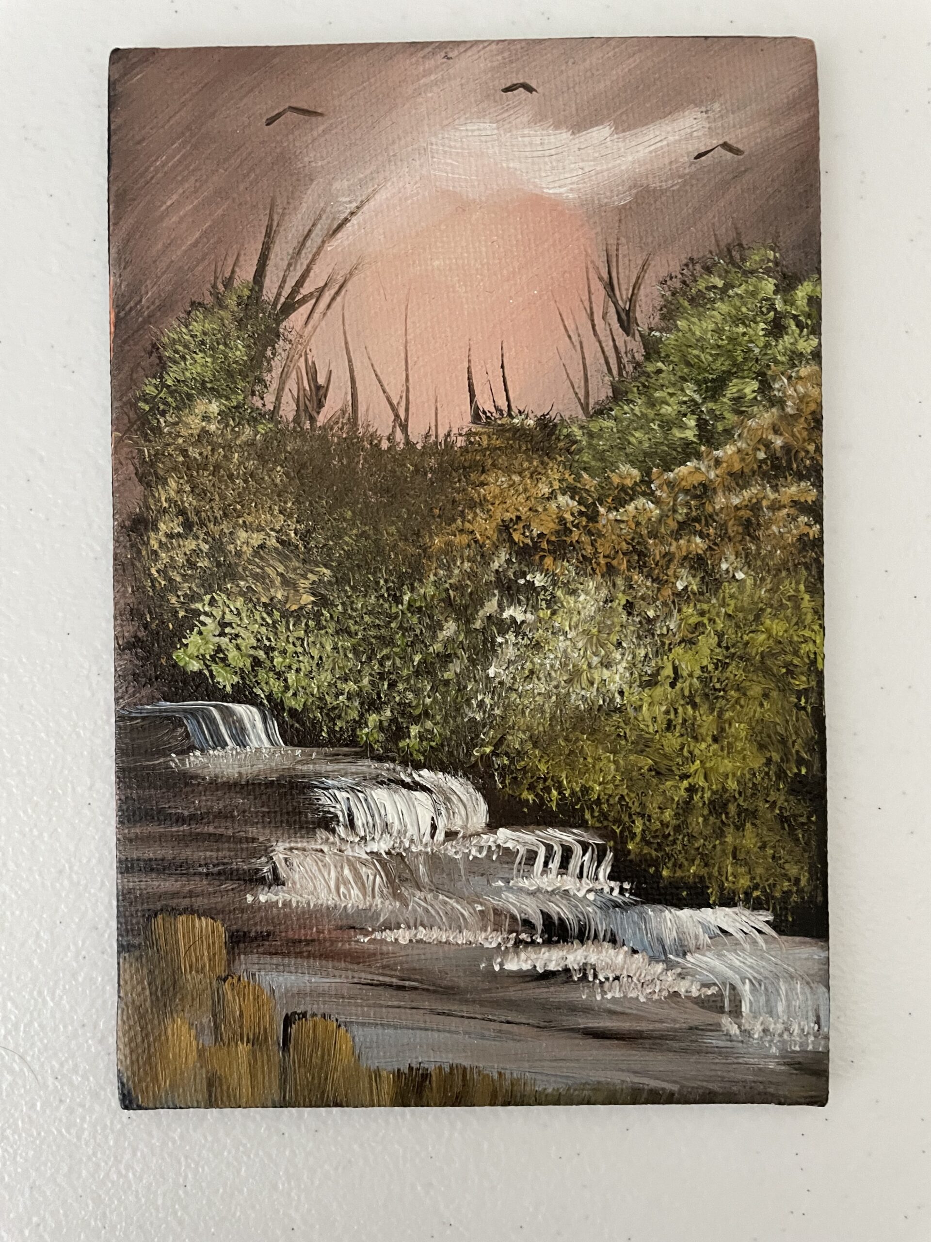 A gentle scene on a small scale, this 4×6 original canvas panel captures a quiet moment at the edge of a forest. Painted in greens and purples, it evokes a pause, an in-between space where movement slows and reflection deepens.