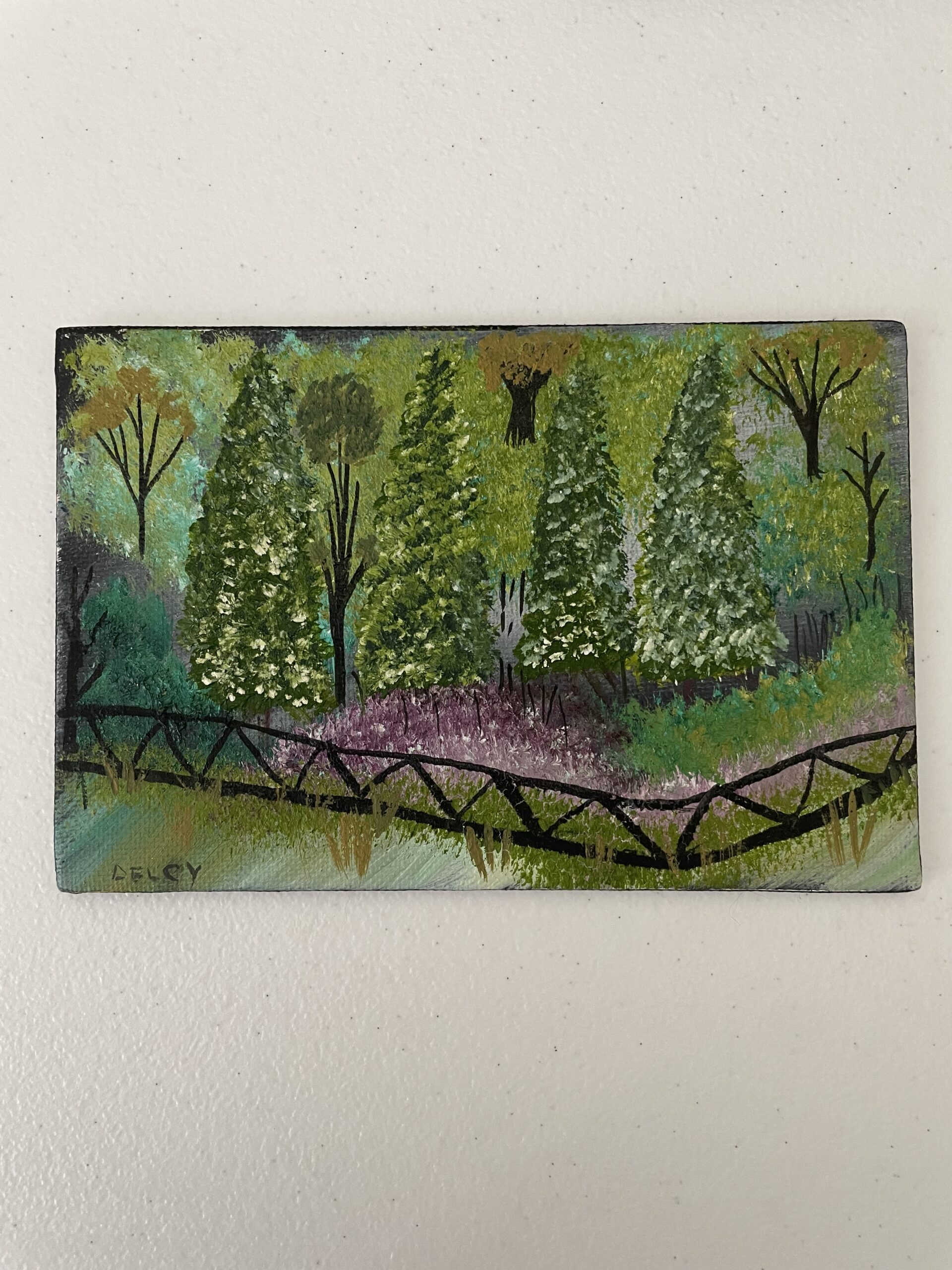 A 4 x 6 original canvas panel featuring a decorative fence along the edge of a quiet forest. This simple, peaceful scene offers a moment of stillness – an invitation to pause before the next step.
